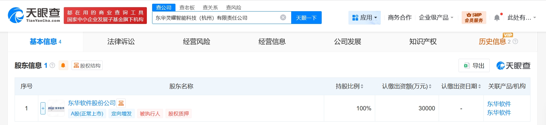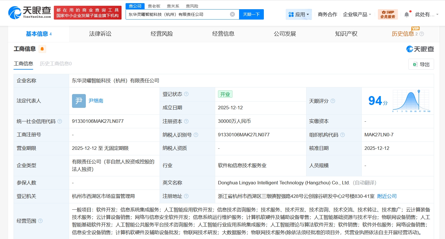 雷达财经讯,天眼查App显示,近日,东华灵曜智能科技(杭州)有限责任公司成立,法定代表人为尹继南,注册资本3亿人民币,经营范围含信息系统集成服务、人工智能应用软件开发、信息技术咨询服务、云计算装备技术服务、云计算设备销售、网络与信息安全软件开发、信息系统运行维护服务、计算机软硬件及辅助设备零售、人工智能基础资源与技术平台、物联网设备销售等。股东信息显示,该公司由东华软件(002065)全资持股。